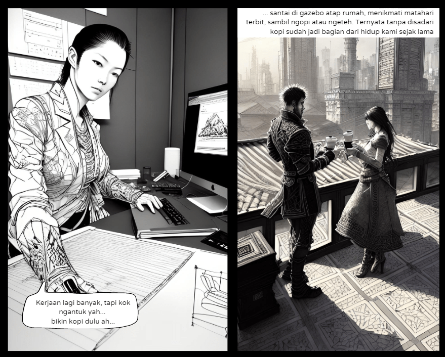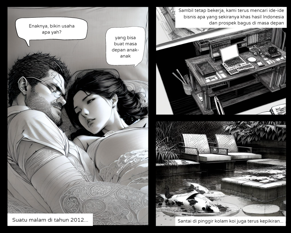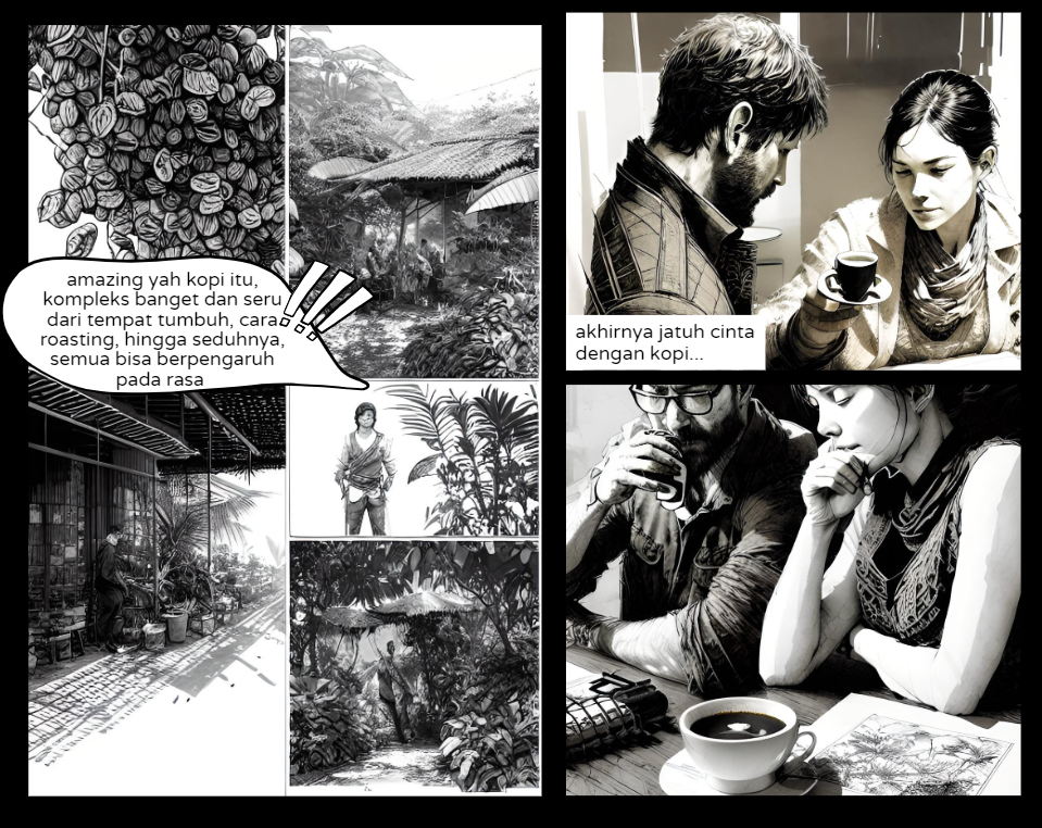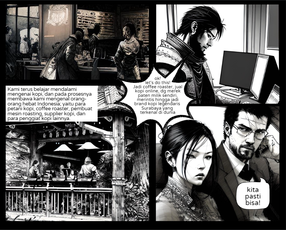 Recruitment staff yang dapatnya cewek semua waktu itu, tanpa pengalaman, kami latih sendiri jadi Barista manual brew untuk dapat melayani pembeli. Konsep produk kopi bergambar karakter kami ciptakan agar customer dapat lebih mudah membedakan tiap jenis kopi yang diminumnya, dan agar mudah mengingat & mengidentifikasi jenis kopi yang disukainya. Karakter kopi tersebut kami wujudkan juga pada design outlet yang ber-tema unik.