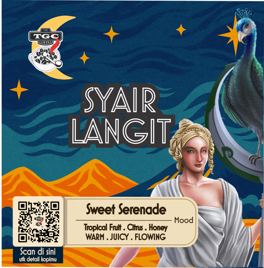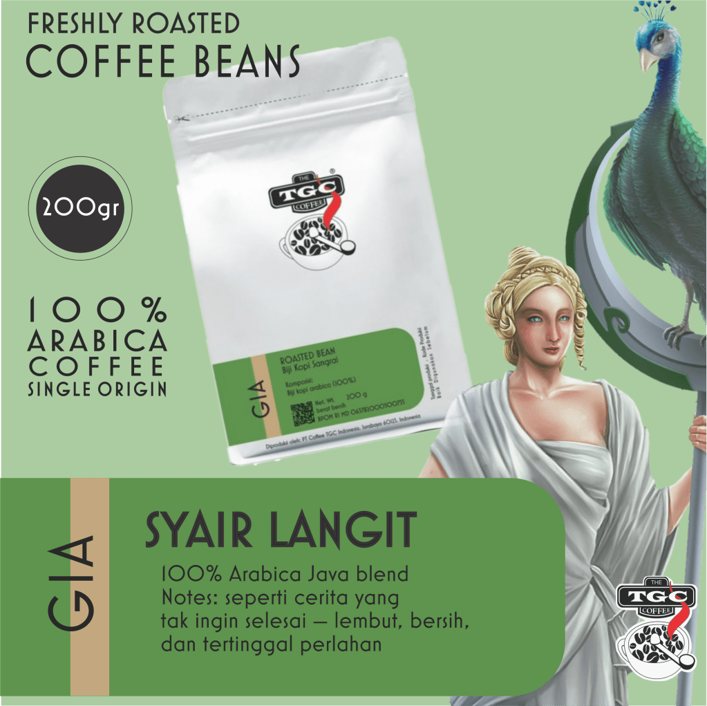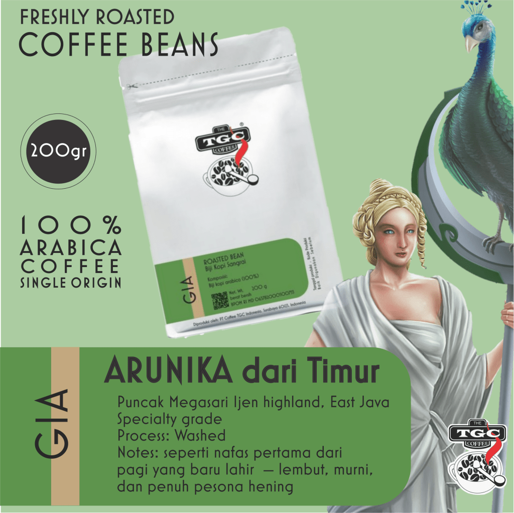 Karena setiap kopi punya asal, dan setiap rasa punya jiwa yang menjaganya, TGC mem-isual kan kopi ini sebagai GIA. Seorang dewi yang tergambarkan membawa tongkat dengan merak jawa di atas nya.