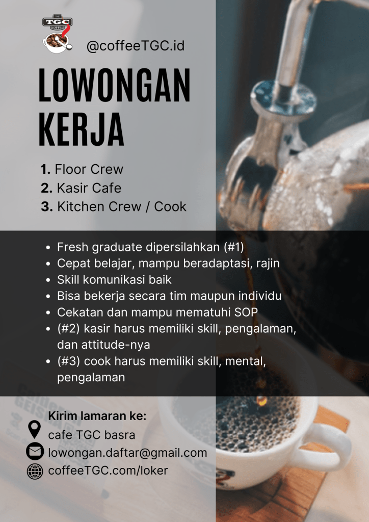 - Full Time: Tidak sedang bekerja di cafe lain dan atau kuliah; lebih diutamakan