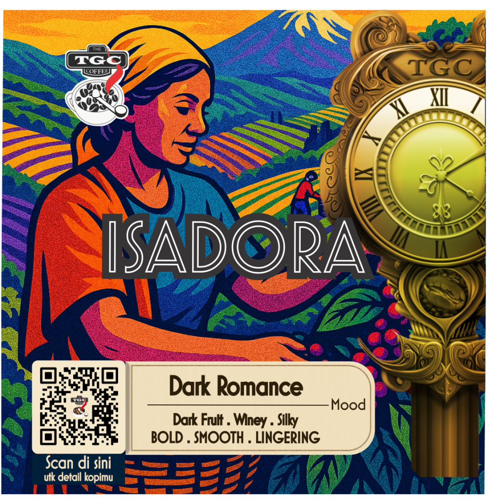 Origin: Ayuyus Mountain, Amazonas, Peru 100% arabica coffee Altitude: 1600-1900m ASL Process: Natural Variety: Gesha Tasting notes: Secangkir Isadora terasa seperti cahaya bulan yang mengalir dalam gelas anggur tua. Winey, cherry liquor, purple grape Isadora — Dia berjalan dengan penuh misteri dan percaya diri, diselimuti oleh beludru dan mimpi. Isadora begitu berani namun tetap anggun — parfumnya adalah aroma dark ceri, suaranya seperti dengung lembut musik jazz di larut malam. Seperti anggur merah yang lembut, kehadirannya terus membekas.