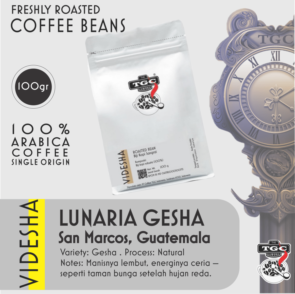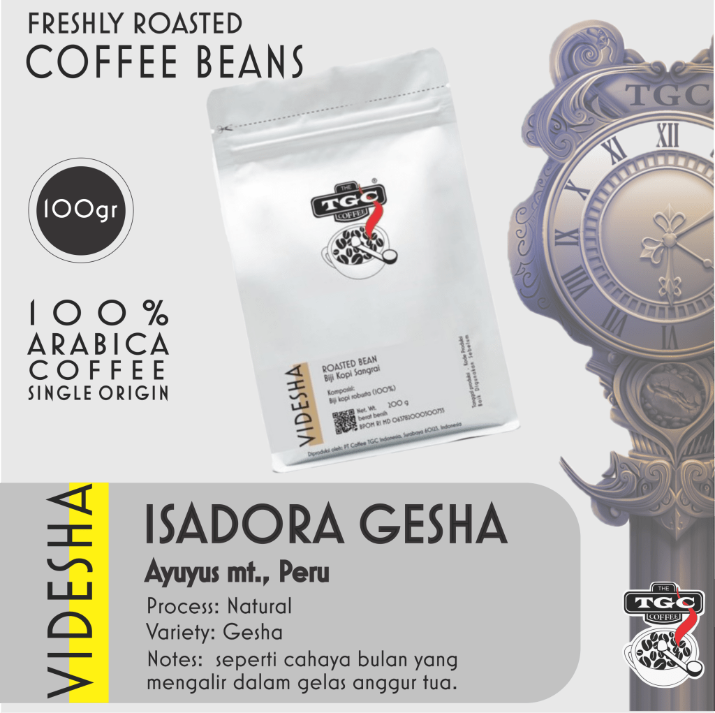 Untuk memudahkan mengingat jenis kopi yang kamu sukai ini, TGC mengelompokkan-nya kedalam karakter VIDESHA – dalam bahasa sansekerta विदेश berarti “luar negeri” atau “negara lain”. TGC mem-visual-kan karakter kopi ini dengan sebuah jam antik. Jam ini jarumnya tidak bergerak, inspirasi untuk tagline TGC: “time stops in a cup of coffee, so enjoy!” serasa waktu berhenti saat menikmati secangkir kopi TGC